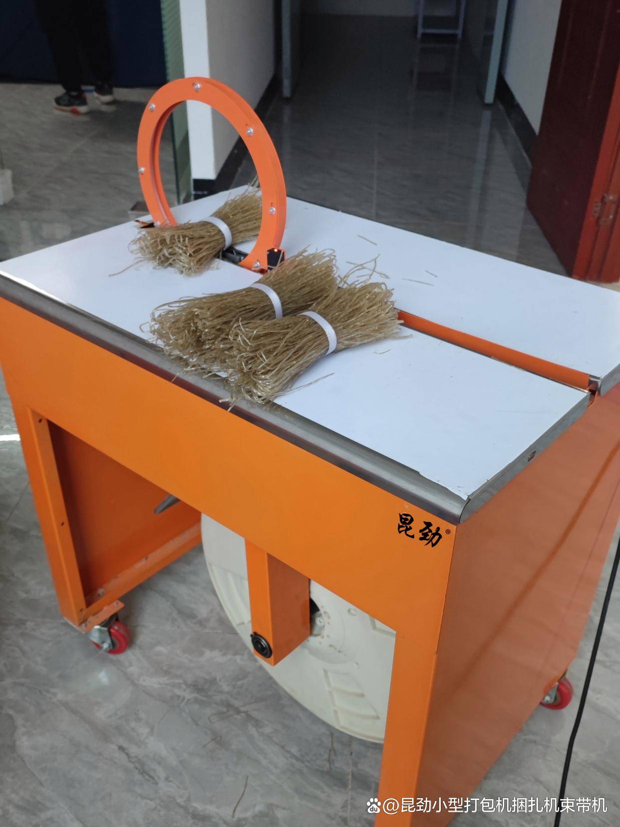 1. KJ-CH25捆扎机:轨道式设计,使用pp带打包带红外感应自动捆扎粉条牢固不会散,2秒一捆。