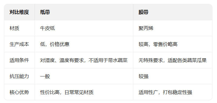 对比维度纸带膜带材质牛皮纸聚丙烯生产成本低,价格优惠较高,零售价略高适用条件对湿度、温度有要求,不适用于带水蔬菜无特殊要求,适配各类蔬菜瓜果抗压能力一般较强核心优势性价比高,日常常见材质适用性广,打包稳定性强