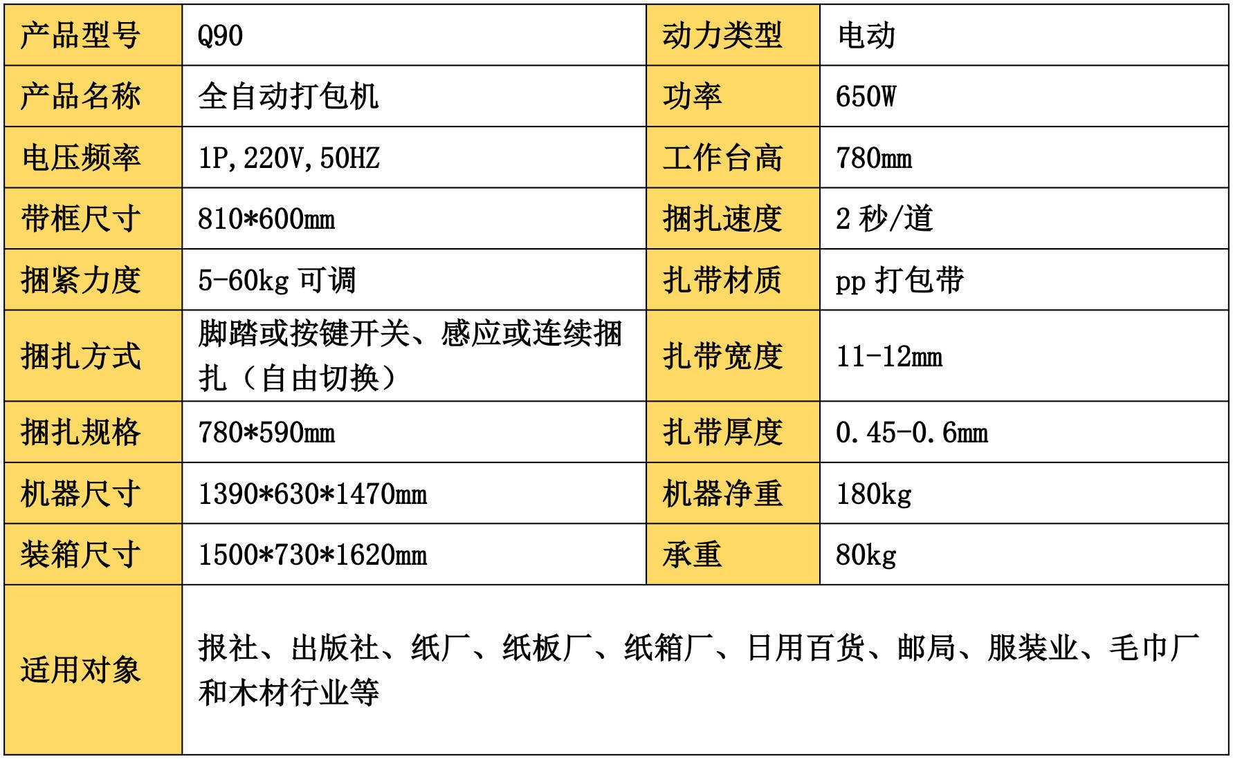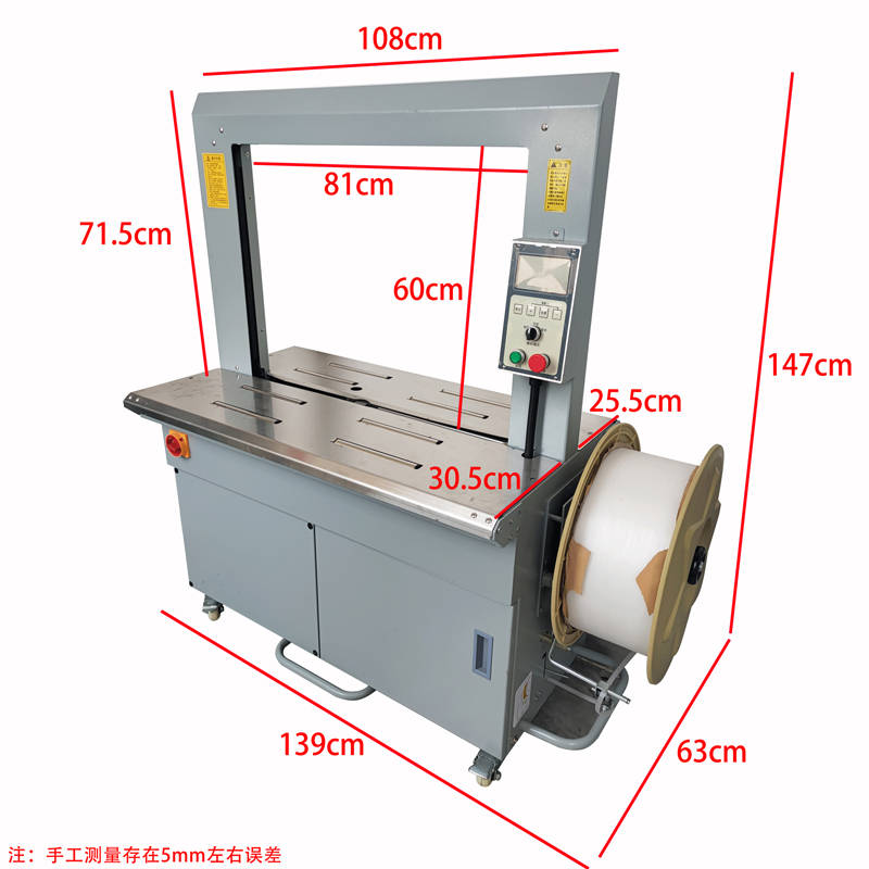 在核心规格上,该机优化了空间与承重设计:810*600mm 的带框尺寸,可覆盖绝大多数工业产品的捆扎范围;780mm 的工作台高度符合人体工程学,减轻操作人员长期作业的疲劳感;80kg 的承重能力与 180kg 的机身净重,保证了设备在高强度运转下的稳定性,不易出现晃动、卡带等故障,有效降低设备维护成本。